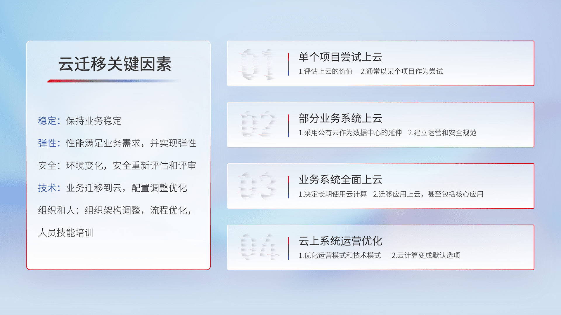 结合实际业务,,,,从规划设计、、、云平台选型、、云原生改造、、、、数据迁移、、、、集成交付,,,迁移全过程为客户识别最佳上云路径,,,,做好风险识别管理,,,设计网络架构、、、身份权限、、、、安全审计合规、、、操作审计、、、日志审计、、、、监控告警策略、、多站点容灾设计等,,,对云上基础设施进行整体规划,,提升IT治理水平,,以满足弹性、、、、高可用、、高性能的需求。。。。