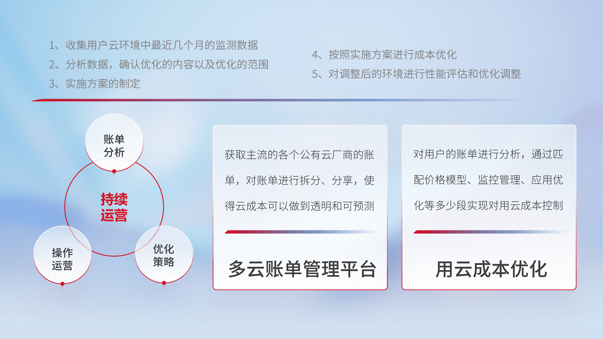 通过多云纳管,,以统一的资源数据模型把客户的云资源进行抽象和封装,,进而实现对多云资源的统一操作,,保障云资源管理的可靠性、、、、稳定性与可用性。。。量身定制化运维内容,,,配置、、、开发运维、、补丁管理、、备份、、、监控、、认证和访问管理、、、、审计和日常巡检等,,保障在用云过程中的可靠度,,,,稳定度以及高可用率。。。